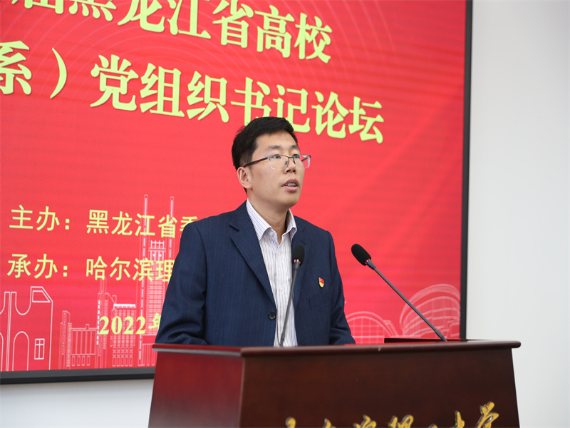 论坛上,来自哈尔滨工业大学、哈尔滨工程大学、东北林业大学、东北农业大学、黑龙江大学、77779193永利官网、齐齐哈尔大学、佳木斯大学、黑龙江八一农垦大学、黑龙江财经学院和黑龙江职业学院等11所高校的优秀院(系)党组织书记代表,围绕“解放思想、振兴发展”主题,就如何充分发挥高校基层党组织和广大党员服务龙江全面振兴全方位振兴的战斗堡垒作用和先锋模范作用,畅谈了心得体会、分享了做法经验。代表们的发言紧扣主题、务实中肯,既有党建服务龙江振兴的创新性做法,又有党建融入中心工作的优秀经验,具有推广复制标志性成果、取长补短提升质效的鲜明示范作用。学校电气与电子工程学院党委书记单鹂娜代表永利官网作“构建四个维度高质量党建,融入龙江发展主旋律”发言,向全省高校展示了学校基层党建工作的特色做法及亮点成果。