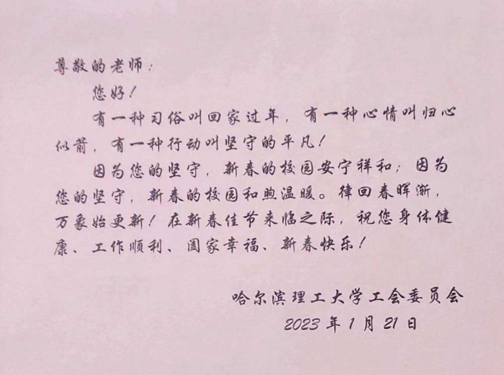 岁寒情深暖人心,广大干部职工衷心感谢学校领导的亲切慰问和新春祝福,衷心感谢校院两级工会组织的暖心关怀。纷纷表示,学校的发展变化日新月异,师生员工的获得感、幸福感、满足感与日俱增,身为理工大家庭的一员,倍感骄傲和自豪。同时表示,一定坚守岗位、履职尽责,用实际行动保障寒假和春节期间相关服务保障设备的正常运行,确保校园安全稳定,为学校发展建设作出应有的贡献。