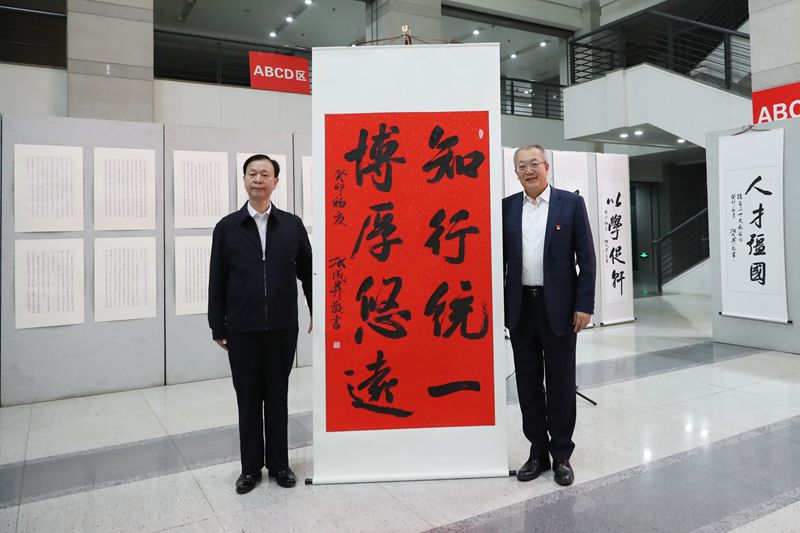 仪式上,学校党委书记赵琳接受张成生“知行统一 博厚悠远”的校训字画赠予。