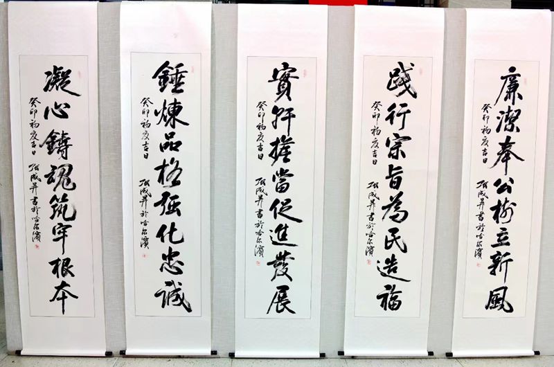 为深入开展学习贯彻习近平新时代中国特色社会主义思想主题教育,让师生切实感受新思想的魅力和力量,感受书法带来的文化享受,领略传统文化艺术,推动主题教育走深走实。6月6日上午9时,由党委宣传部举办的“学习新思想奋进新征程”主题书法展开幕式在西区教学主楼一楼大厅举行。省委第十九巡回指导组组长李皎,指导组成员唐国忠、张志群莅临开幕式现场,校党委书记赵琳、党委副书记郭加利,党委常委、组织部部长赵水杉出席仪式,黑龙江出入境边防检查总站副总站长、中国书法家协会会员、中国书画艺术委员会副秘书长张成生受邀出席。开幕仪式由党委常委、宣传部部长刘迪主持。
