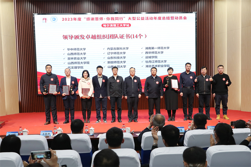 活动过程中,教育部教师工作司副司长翁波、教育部思想政治工作司副司长王发洲、中国教师发展基金会秘书长宋家乐共同向“感谢恩师·你我同行”大型公益活动优秀高校代表颁发了活动证书,并向各高校学生代表授旗。中国教师发展基金会联合新东方大学生学习与发展中心向黑龙江省教育厅捐赠了价值1920万元的学习礼包。