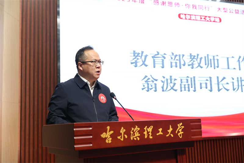 教育部教师工作司副司长翁波在活动中讲话,他强调,“感谢恩师·你我同行”大型公益活动自2016年举办以来,形成了广泛影响力,在全社会营造浓厚的尊师重教氛围。要以此次活动为契机,希望同学们常怀感恩之心,将尊师爱师付诸实际行动,让尊师重教的优良传统传承和弘扬下去。希望广大教师牢记习近平总书记嘱托,担当起新时代赋予广大教师的光荣使命,争做四有好老师,将学生培养成德智体美劳全面发展的社会主义建设者和接班人。