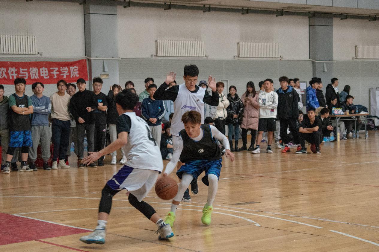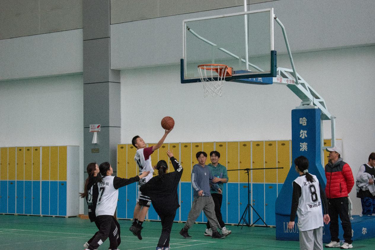 本次篮球赛在准备阶段便受到了各院学生的重点关注,比赛开始前围观的同学们便自发组成拉拉队,为即将上场的各位运动员加油打气。运动员们进行简单的动员后,按照之前的抽签顺序,展开了激烈对抗。伴随着哨声的响起,现场的气氛急剧攀升,双方很快进入了“战斗模式”,比分交替上升,僵持不下。团队之间的默契传球、完美配合引来围观同学的一阵阵喝彩。