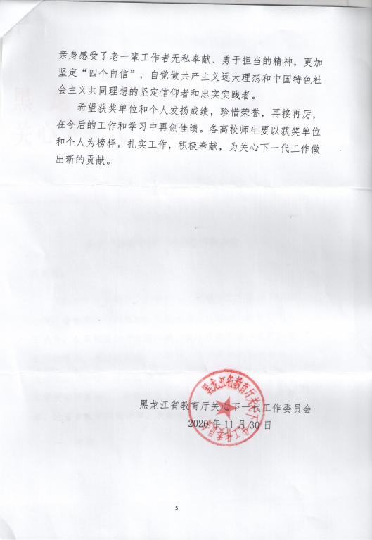 近日省关工委评选结果揭晓,永利官网共有五项作品获奖。机械学院机械工程系党支部选送的《严师有礼振绩有加——记77779193永利官网李振加教授》荣获视频类一等奖,宣传部选送的《使命、贡献、传承》荣获视频类二等奖;周长群、张强撰写的雷清泉院士的《五十八载教研梦耄耋之年谱新篇》荣获征文类一等奖,徐状撰写的计算机学院博士生导师郝忠孝的《扎根黑土地情驻哈理工》荣获征文类二等奖,计算机学院退休教授王广肇撰写的《将青春年华献给哈理工》荣获征文类三等奖。
