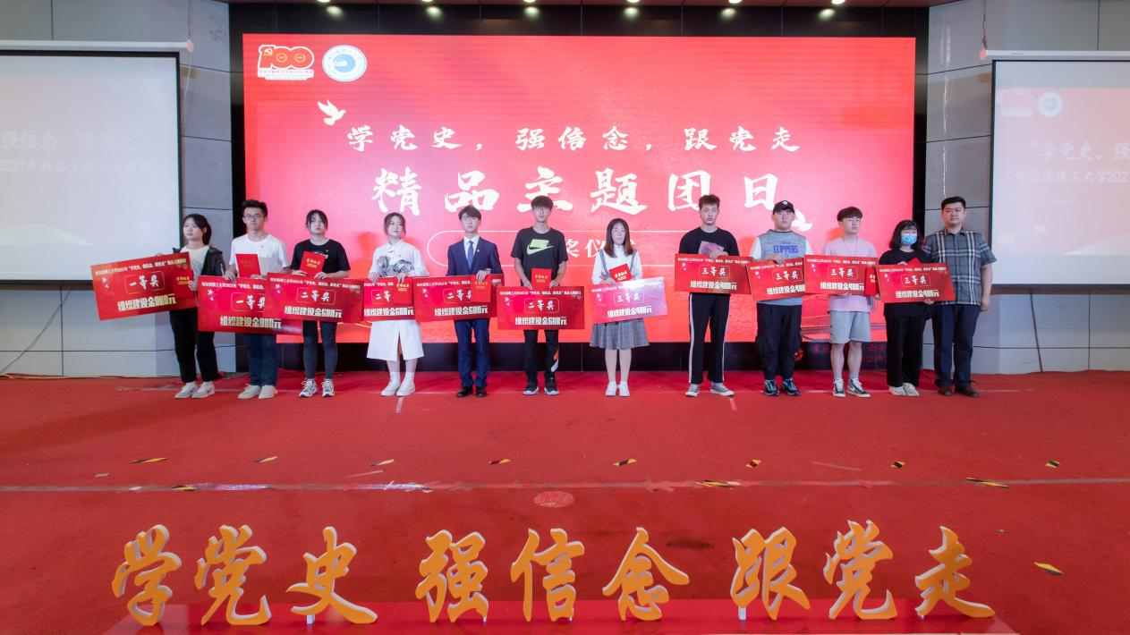 本次“学党史、强信念、跟党走”精品主题团日评选活动共分为学院初评和校级复评两个阶段,初评中12个学院团委依托智慧团建系统共评选出103项院级优秀主题团日活动,通过各学院团委复审,共推选报送30项参与校级精品主题团日活动评选,经校团委,学工部复评,最终评选出精品主题团日一等奖二名,二等奖四名,三等奖六名,优秀奖十名,优秀组织奖三名。展演上由机械动力工程学院机械20-2班团支部、理学院应物19-1班团支部、统计20-2班团支部、自动化学院机器人工程19-2班团支部为全校带来示范性主题团日活动的精彩展示。活动初始,机械动力工程学院机械20-2班团支部带来《“建党百年,不忘初心”朗诵》团活展示中,支部成员们以铿锵有力的气势,充沛饱满的感情,自信大方的形象表达了对祖国母亲、对中国共产党的感激和热爱之情,赢得了老师和同学们的阵阵掌声。随后,理学院应物19-1班团支部在《学习东北抗联精神演讲》团活展示中通过支部成员分段演讲的形式带领现场观众再次感悟东北抗联精神,回顾了抗联英雄杨靖宇、赵一曼浴血奋战、救亡图存的英雄伟绩,演讲者庄严低颂声引起了在场同学们对英烈祭奠缅怀的共鸣。理学院统计20-2班团支部以电影《建党伟业》中“中共一大会议”经典片段进行情境性展演,通过带领同学们“重拾红色记忆”,点燃了在场同学们的爱国热情,也使同学们体会到了中国共产党百年奋斗经历坎坷磨难却依然不忘初心。随后自动化学院机器人工程19-2班团支部在舞台现场还原再现了班级团支部新团员入团仪式,庄严隆重的入团宣誓仪式中,嘹亮的宣誓呐喊声彰显了该团支部成员特有的朝气和积极向上的品质。最后,与会领导、老师们与展演班级成员合影留念。