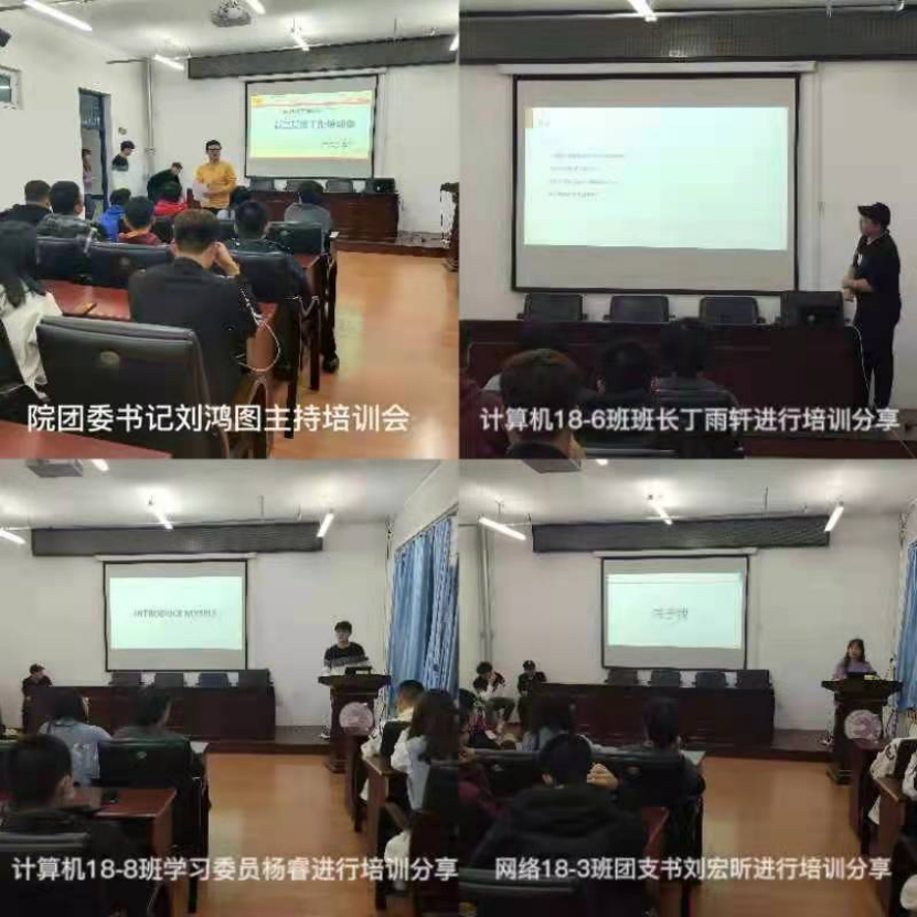 首期学生干部培训主讲人为:计算机18-6班班长丁雨轩(一等奖学金获得者,学年就业工作推进组组长,曾获字节跳动、团美、阿里淘宝实习offer,目前签约阿里巴巴。班级团结向上,有实习经历同学多,签约大厂多,目前班级offer落实率为57%);计算机18-8班学习委员杨睿(一等奖学金、ACM亚洲区银牌获得者,学年综合测评工作总负责人,学年 “408”工作组(考研专业课复习帮扶)组长。目前保送北京航空航天大学。班级学习氛围浓厚,四级通过率超过80%);网络18-3班团支书刘宏昕(国家级大创项目参与人、多项省级以上竞赛获奖,辅导员工作助理,学年工作协调人,目前保送吉林大学。班级同学参与竞赛人数多、获奖人数多、入党人数多。)。三位主讲人结合自身工作、学习经历,从学年、班级、个人发展三个层面,就具体工作、班委团队打造、班级集体建设、工作与个人学习协调发展等方面进行了经验和感悟分享,赢得参训同学热烈掌声。