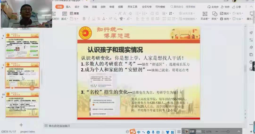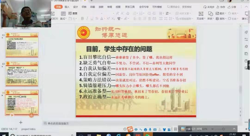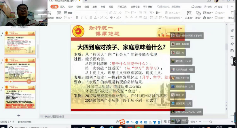 针对家长们普遍关心的学生发展问题,刘鸿图老师从就业市场变化、考研准备、学生存在的问题入手,对家长如何帮助孩子利用这一年实现从“校园人”向“社会人”转变进行了指导,形成家校合力,帮助学生克服疫情影响,实现充分发展。