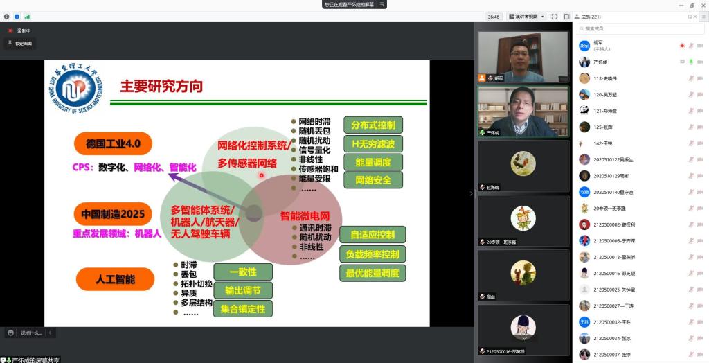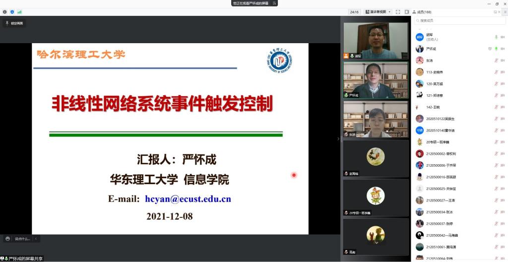 为了加强院校间的学术交流、营造浓厚学术氛围、开阔师生学术视野、加强学院科研团队建设,应自动化学院胡军院长邀请,科技部中青年科技创新领军人才、华东理工大学严怀成教授为永利官网师生作了题为“非线性网络系统事件触发模糊控制”的学术报告。2021年12月8日,在科技处的大力支持下,主题报告通过腾讯会议线上举行。自动化学院班子成员、学科带头人、方向带头人及来自相关学院的230余名师生在线参会,报告会由自动化学院院长胡军教授主持。