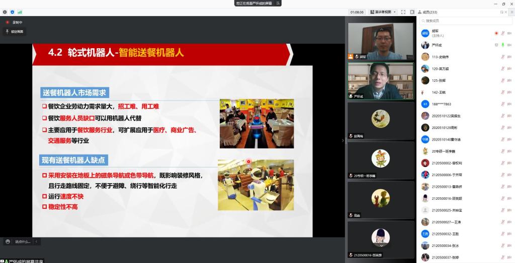 严怀成教授在报告中重点分享了转移概率部分未知的模糊Markov跳变系统的保成本控制、基于隐Markov模型的异步H∞跟踪控制、非线性多智能体系统的异步动态事件触发、基于非周期采样的非线性系统控制等前沿热点问题,深入浅出地介绍了问题研究的实际工程背景、研究思路以及该方向的最新研究成果;对Markov跳变系统、多智能体系统、采样系统和网络化控制系统的特点、优点、性能指标和存在的问题进行了简要的介绍;讲述了时间触发采样机制和事件触发采样机制的机理和优缺点;通过单连杆机械臂系统、Hénon系统和Rossler等几个实际算例展示了所提出的控制方法的有效性,并介绍了团队在智能无人驾驶、轮式机器人、康复机器人、无人系统协同、网络安全等方面的应用和成果,为我院师生展示了一个优秀团队的拼搏和严谨,对参会师生产生了极大的鼓舞。严怀成教授与我院师生针对模糊方法处理非线性系统是否需要满足某种特定条件、如何选取实际算例、如何降低结果的保守性、以及模糊化与去模糊化如何实现等问题进行了热烈且深入的讨论,提出了许多具有建设性的意见和建议。严怀成教授被自动化学院师生的热情所感动,鼓励学生进一步深造,加强合作交流。最后,胡军院长再次感谢严怀成教授的精彩报告和与会交流。