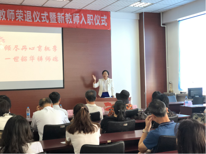 退休教师代表赵明媚表示:老教师在这个舞台上的谢幕,新老师在这个舞台上登场,她希望,年轻教师接好老教师的接力棒,在这个舞台上不断创造新成绩。赵明媚老师说做好一名思政课教师应该做好以下四点要求。首先,爱岗敬业,尊重自己的选择。其次,用心教学,超越自我。爱这一行就要用心去做,要用心备课;用心讲课;做学生的知心朋友。再次,勤奋钻研,提高自我。她强调作为教师更要加强锻炼,健康自我。最后她感谢领导、同事们一直以来关怀和帮助。