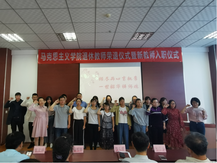 仪式上,院党委书记李燕军向退休教师致以了诚挚的敬意和衷心的感谢,同时对新教师的加入表示热烈的欢迎;院长张立双和副院长伍玉林为荣退教师代表赠送了纪念品;哲学系孟偲老师带领新教师进行了入职宣誓,坚决做到政治强、情怀深、思维新、视野广、自律严、人格正,努力成为一名合格的思想政治理论课教师。