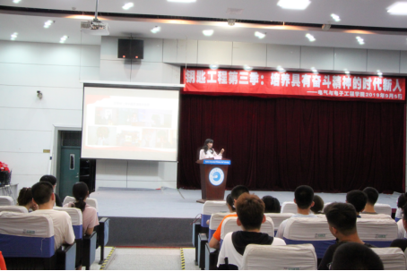 值此新中国成立70周年,全国开展“不忘初心、牢记使命”主题教育之际,为培养具有奋斗精神的时代新人,2019年9月5日18:00,电气学院党委副书记兼副院长李丽老师,以“培养具有奋斗精神的时代新人”为题为电气学院2019级全体新生开展讲座。本次讲座由电气学院19级新生辅导员张晶老师主持,电气学院19级新生辅导员周广老师和电气学院全体新生参加了此次讲座。