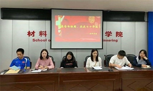 2019年9月28日下午15:30,材料学院在五号楼212召开了为祖国庆生系列活动之“青春告白祖国,共庆七十华诞”主题报告会。出席本次报告会的有“全国五四红旗团支部”材型14-4班团支书姜雪晴、研究生学生干部施倩、研究生学生干部都书强、学生第五党支部副书记邱金月、材料学院团委副书记黄炜佳、学生处18级档案处主任赵泽铭,材料学院团委学生会学生干部、2019级全体班干参与了此次活动。