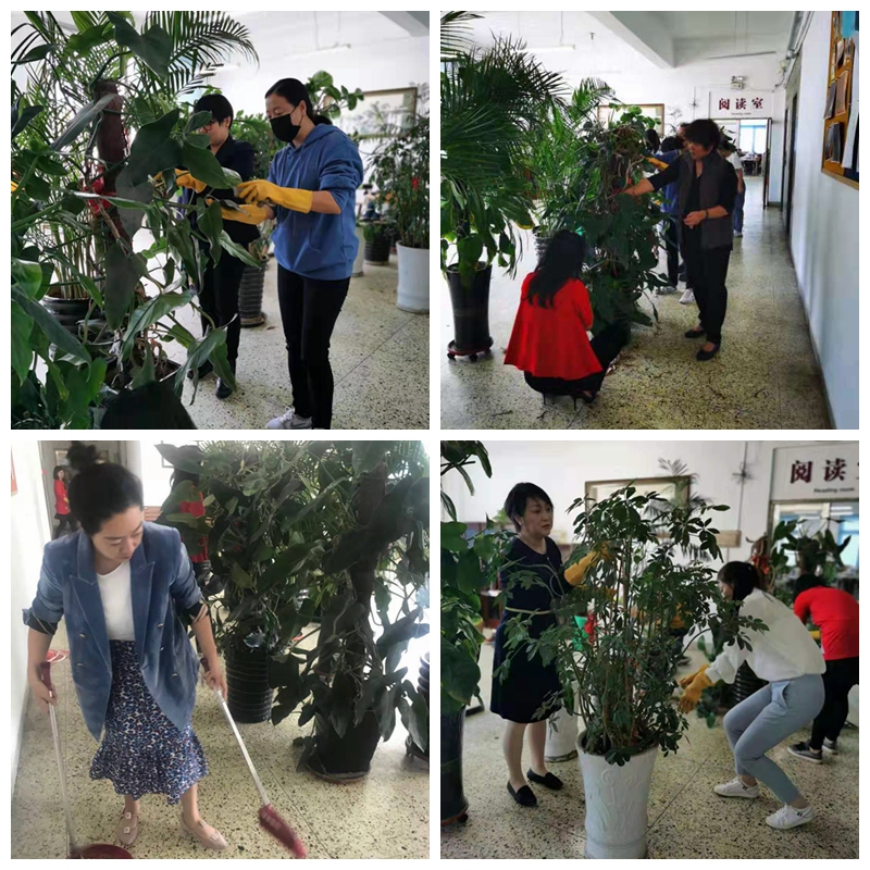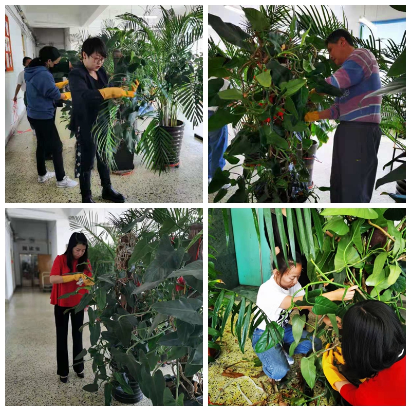 西区党小组共9名党员积极参加了此次活动,西区图书馆馆长程洪英给予了热情的指导,程老师和曲萌老师主动参与进来,齐心协力对西区馆内阅览室、自习区的花木进行了整理、清洁、养护。经过除虫、填土、整形、修剪、擦灰的辛勤劳动,植物换新颜,更加生机勃勃,让读者能够在绿色、舒适、整洁的环境中,感受到良好的书香氛围。