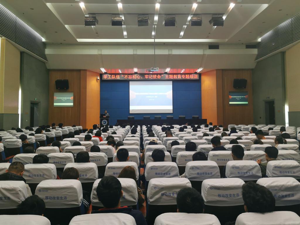 为深入贯彻落实党的十九届四中全会精神,将“不忘初心、牢记使命”主题教育做细落实,进一步提升永利官网大学生思想政治教育工作实效,11月5日下午,学校在教学主楼五楼报告厅举行学工队伍“不忘初心、牢记使命”主题教育专题培训,邀请全国优秀教育工作者、天津医科大学郭琳老师作题为“探索生命视域下高校立德树人的核心内涵”的讲座。学校党委副书记陆岩出席会议,学生处、团委工作人员,各学院主管学生工作书记、副书记,全体辅导员,学生班级心理委员代表等近400人参加培训。学生工作部(处)部(处)长杨忠学主持培训会。