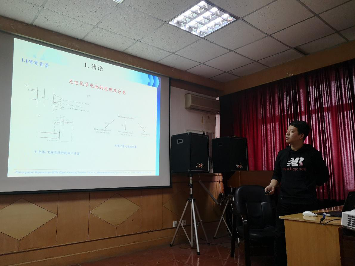 黄跃武博士随后做了题为:“TiO2基光电化学光伏电池的光电性能研究”的学术报告。光电化学光伏电池是一种可实现光能向电能转换的光电化学器件,包括染料敏化太阳能电池及光电化学紫外探测器。光阳极作为其重要组成部分,影响着光电化学光伏电池的性能。围绕改善TiO2光阳极特性,以期提高光电化学光伏电池的光电转换效率这一主题,提出了等离子体共振增强提高器件光电转换效率的方法。通过实验研究及理论模拟,对Au/Ag等离子体共振增强机理进行了系统的研究。