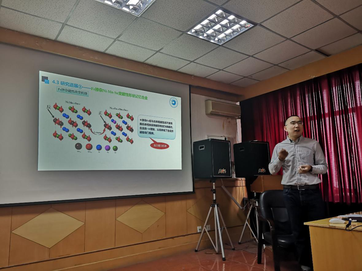 22日的新入职青年教师学术报告部分,张琨博士首先做了题为:“NiMnSn磁性形状记忆合金的研究”的学术报告。Ni-Mn-Sn变磁性记忆合金既有传统温控形状记忆合金的典型特征,又能够由磁场诱发产生形状记忆效应,是一种集“传感”与“驱动”的新型智能材料。但是,其当前存在三大瓶颈问题:1.材料脆性大,机械性能差;2.磁驱马氏体相变温度低,工作温区窄;3.磁驱门槛值太高。针对这些问题,通过添加适量的稀土及过渡族金属Cu对Ni-Mn-Sn合金的力学性能进行改善;系统地研究了稀土及Cu掺杂对合金的微观组织、马氏体相变行为、力学及磁性能质的影响规律和物理本质。然后,为满足其高温环境下的特殊应用需求,采用Cu、Co共掺杂的手段,在改善合金脆性和提高磁热效应的基础上,同时提高了Ni-Mn-Sn磁性记忆合金的工作温度。