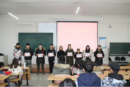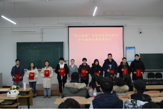 12月23日,为了以赛促学,落实习近平总书记关于学习、关于青年的重要指示精神,培养有理想、有本领、有担当的新时代青年人由教务处、学工处、校团委主办,外国语学院承办的“学习强国”习近平总书记金句外文翻译竞赛颁奖仪式在南区1-544教室举行。外国语学院党委副书记周晓丽出席仪式,并为获奖团队颁奖。