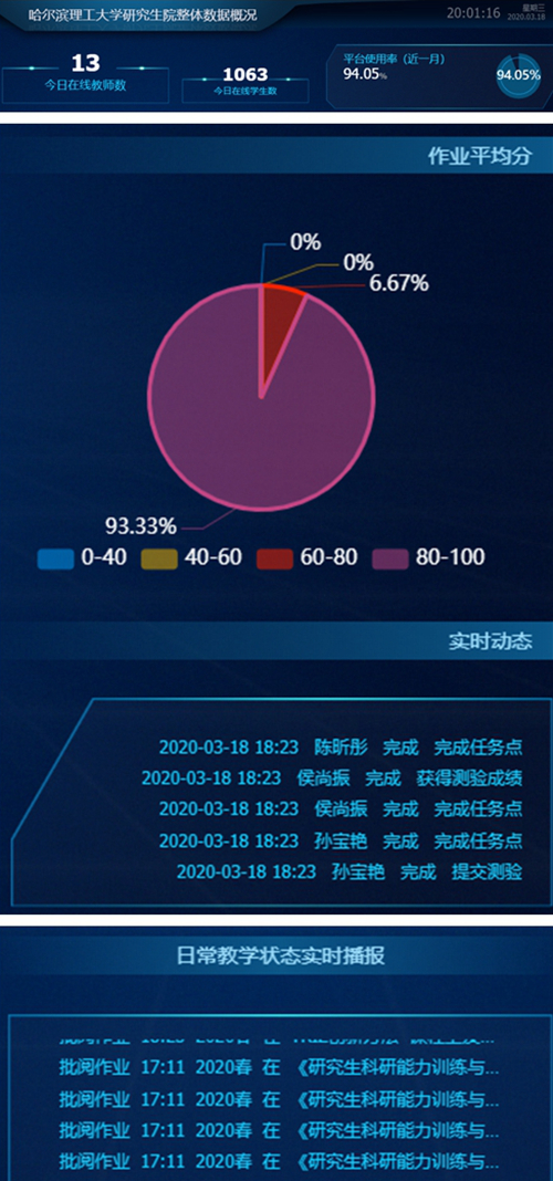 课程学习过程中,研究生教学督导、研究生部培养办及学院有关教师全程跟踪,监督学生的学习状况。通过超星教学平台,可以追踪学生的IP、查看学习时间、章节测验的成绩状况等,使学校能够在一定程度上掌握学生的学习状态和效果。同时,为真正达到学习的目的,对于章节测验达不到60分的学生采取了“打回”重温的措施,使学生能够对知识能够进一步理解和记忆。