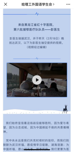 同时,我们还收到了匿名医护人员与联系到的彭医生为同学们带来的温暖与鼓舞视频。