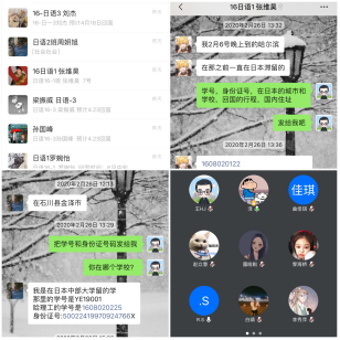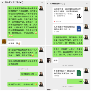 在此次疫情中,16级大部分学生都很迅速的反馈各项信息,虽然有极个别的学生因实习问题会延迟答复反馈,但是学生们早已养成每天看年级通知群的习惯,这使得各项信息统计和信息报送工作得以高效圆满的完成,辅导员与学生之间互联互通的高效管理模式得到了进一步印证。对于疫情防控,辅导员迅速依托班委群、年级群创建了国外疫情防控工作群,要求班干部依托平时工作网络,加强学院——班级两级联防联控信息渠道的畅通,发挥班委和学生党员的作用,号召学生们积极投身这场没有硝烟的“战役”,及时响应学校有关疫情防控的各项工作部署,确保所带的所有学生能随时接收得到信息、反馈得到问题、解决得到问题。