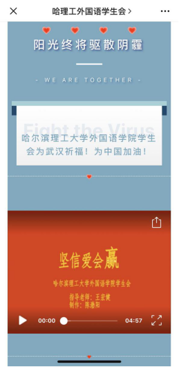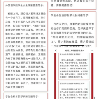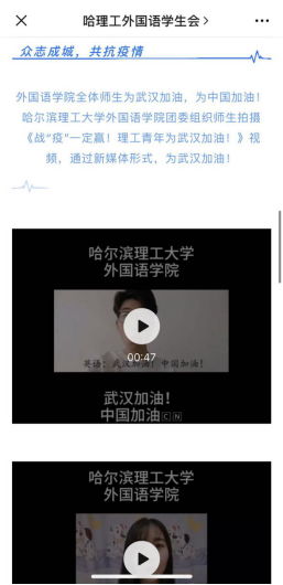同时,学生会收汇了来自外国语学院团委组织师生拍摄的为武汉、为中国加油的视频,积极弘扬了抗疫一心的正能量。