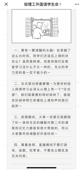 学生会在获得网课开课通知的第一时间后,也推出了相关公众号,督促同学们在家也同样不能懈怠,要认真学习,并对同学们上网课提出了几点建议。