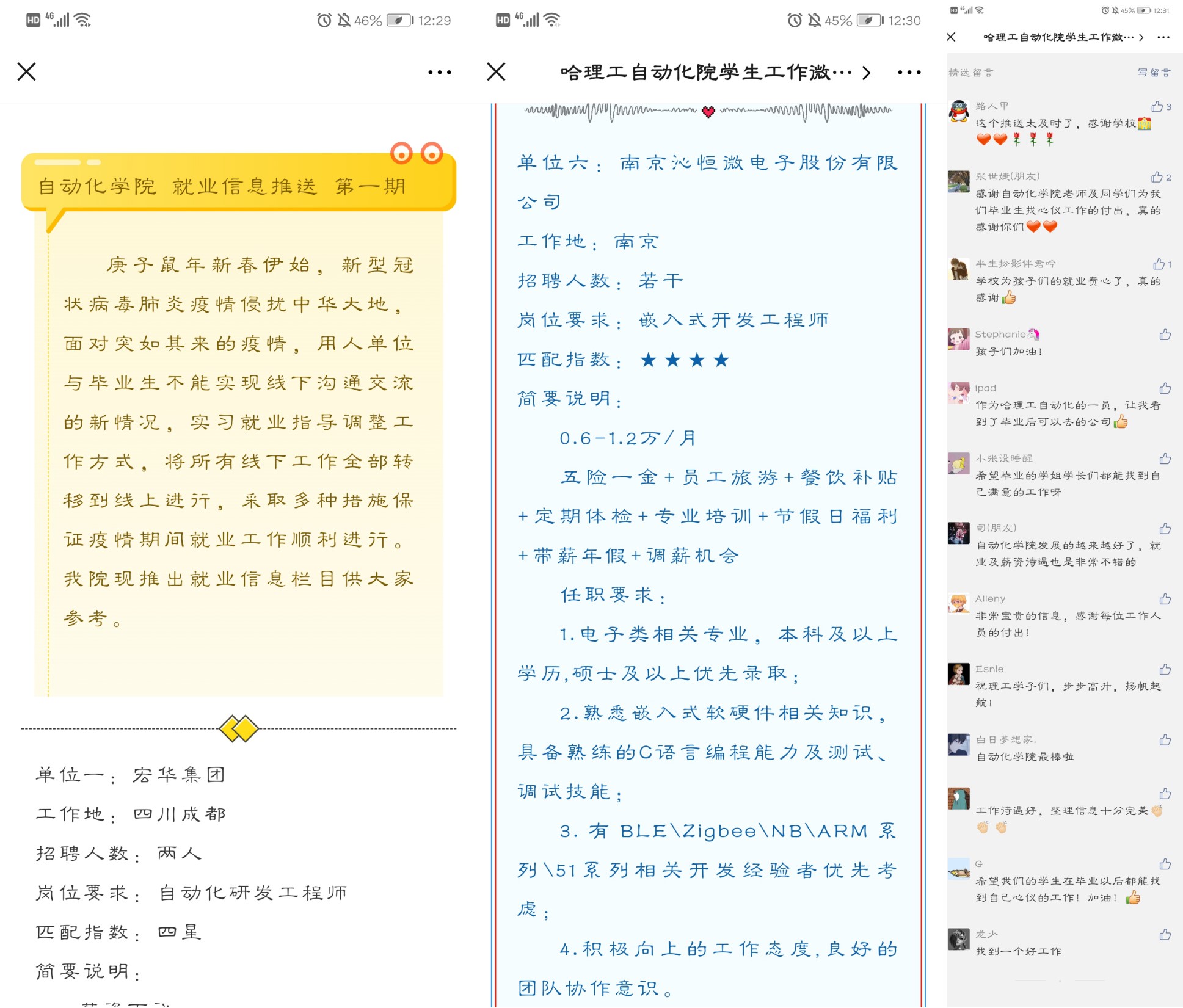 就业信息员团队在学院公众号开辟就业信息专栏,针对自动化和电子信息科学与技术两个专业精准收集、筛选、发布招聘信息,为保证信息的时效性,以两天为单位推送一次。至今已推出就业信息十六期,发布160余家公司500余个工作岗位的需求信息。本系列就业信息均来自于互联网或学院教师推荐,作为学校就业信息网和就业推送群信息的补充,经过工作组的审查、筛选、确认后,发布到就业信息专栏,同时在未就业毕业生和家长微信群中点对点精准推送。
