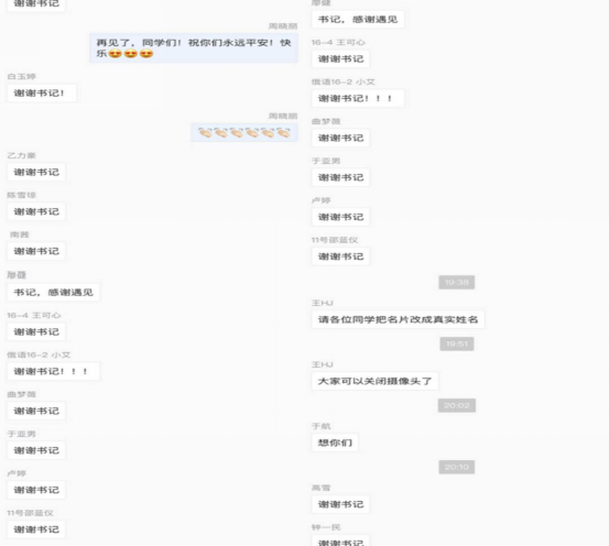 会议中周书记还提出,作为周书记所举办的最后一场16级学生大会,提倡大家进行一场特殊的“合影”,同学们都打开了摄像头,与周书记亲切的叙旧。中间大家数次哽咽,四年的师生情谊是无法被疫情阻断的;它通过网络的文字,图像,语音,蔓延进了大家的心里。这一场特别的毕业送别活动,也落下了圆满的句点,但这份与理工大学外国语学院的情谊,伴着周书记,王宏健导员对大家深深的祝福,会长远的留存于每一位毕业生的心中。