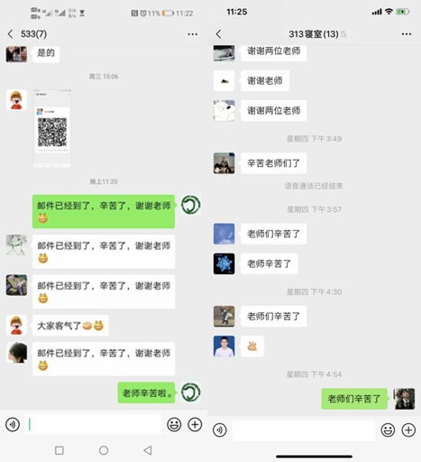 于立洋老师疫情期间肾结石病反复发作,但他没有请假,克服病痛一直坚持为学生整理物品邮寄行李。刘倩,冯月两位老师利用周末休息时间给学生邮寄行李,从早上8点半一直忙碌到傍晚时分才结束回家。在打包的过程中,对学生遇到的问题进行了耐心细致的解答,把学校相关政策和邮寄工作的初衷传达给学生,更好的推进邮寄工作的开展。辅导员郭宝鹏、邵明记老师前段时间刚刚结束研究生行李的邮寄,这次又第一时间报名参加了学院本科生行李邮寄工作。郭老师在七公寓学生寝室忙碌了几天后,脚上磨出了血泡,人也在这些天里消瘦了一圈。尽管很辛苦、很累,但是他却说:“和许多学生相处四年了,由于疫情毕业都难以再见上一面,心里一直觉得很遗憾的,也借这次机会力所能及给他们提供点帮助吧!”见证了老师们辛苦的邮寄,更真切地感受到了母校的温暖和关爱,视频另一端的同学们不禁感动万分。软件16—1班学生赵琳娜说:“今年云毕业的我们,收获到了最深切的感动。我可能永远也忘不了,视频的界面里,老师们忙碌着打包行李的身影,充满力量,高过人头的一摞包裹旁,老师们超级灿烂的笑容,她们真的像女英雄一样。冰冰老师和瑶瑶老师,谢谢你们,让我们在千里之外,感受到四年的回忆和温情,我的老师们,你们辛苦啦。”“辛苦了,老师”“谢谢老师”......一句句温暖的话语回荡在云端,同学们流下了不舍的泪水,他们满怀感激的道谢,让所有老师们都倍感欣慰!