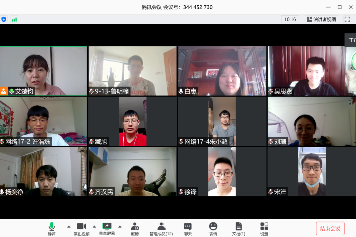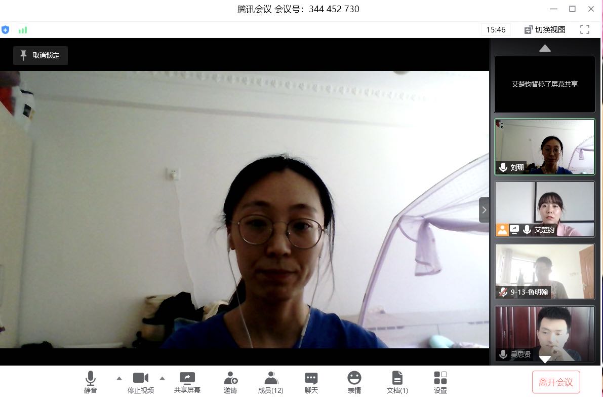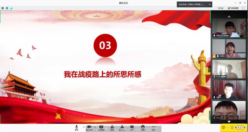 学院学生第一党支部书记艾荻首先为大家上了一堂微党课。课上她以“弘扬抗疫斗争中彰显的‘抗疫精神’为主题”结合自己在疫情防控工作最吃紧的时候,来到距家11公里以外的某社区,成为一名为社区百姓服务的“勤务员”的所见、所闻、所悟。向支部的党员学生讲述联防联控,群防群控工作开展以来社区老党员们的坚守与担当,社区网格员们的辛苦与付出,社区志愿者们的奉献与无畏。特别提到了在她服务社区两个月的时间里,每天都会看到几位白发苍苍带着红袖标的老党员,他们是“李小姐党员宣传巡逻队”。为首的大妈76岁,人送外号“李小姐”,在这个社区是位“名人”,社区居民谁家有大事小情都会找“李小姐”商量。“李小姐”也是名副其实的社区“知心姐姐”。社区疫情防控工作开始以来,这些平均年龄70岁以上的老党员们,自发的组成了宣传巡逻队,每天穿梭于社区的大街小巷,居民楼院,肩背着小音响,手拿着小喇叭将“不串门、不聚会、不聚餐,多洗手、多通风、多运动,非必要不出门,出门戴口罩”,这一句句朗朗上口、好记好懂的防控口号宣传到千家万户,深植于居民的心间。用自己的辛劳和坚守、奉献和汗水密织抵御疫情的宣传网。在宣传疫情防控的同时,他们还不忘随时检查各个小区的护栏,有加固的需要就马上进行修缮。一路走来,风雪不误,他们就像一面旗帜,迎风招展,带动引领着社区工作者下沉一线,护卫万家灯火。这些生动真实而生动的实例,无不感染着在线的党员学生们。