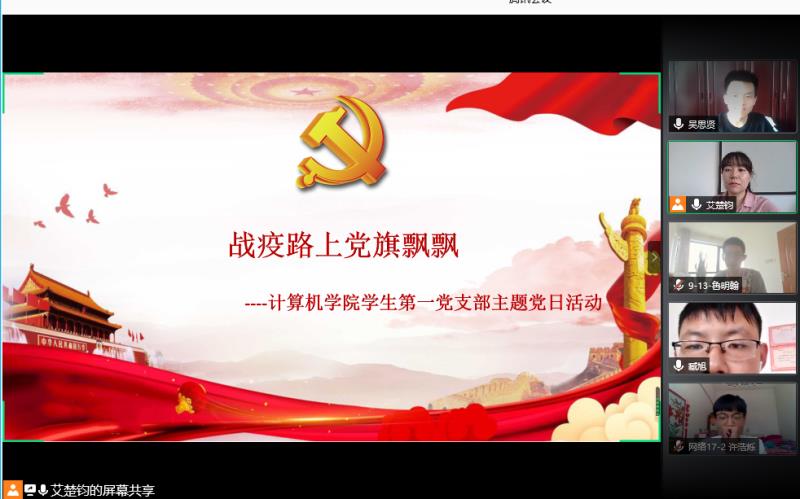 为庆祝中国共产党建党99周年,讴歌党的光辉业绩,回顾党的光荣历程,激励学生党员不惧风雨、勇挑重担,积极投身到疫情防控常态化的学习工作中。依照永利官网党委的相关工作部署,计算机学院学生第一党支部于7月1日上午开展以《战疫路上,党旗飘飘》为主题的线上党日活动。