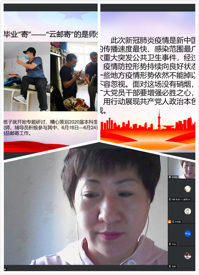 为庆祝中国共产党成立99周年,学习贯彻习近平新时代中国特色社会主义思想,按照学校党委《在常态化疫情防控中持续发挥基层党组织和党员作用的具体举措》工作要求,认真贯彻落实基层党组织和党员在常态化疫情防控中发挥作用,7月1日18时,理学院党委书记端木永东、理学院党委副书记陈迪男及全体辅导员通过腾讯会议与本科生党支部77名学生党员在云端相聚,会议主题以“从疫情防控看党员的初心与使命”为题,帮助学生党员正视疫情所带来的危机与挑战,审视“疫情常态化下”学生党员要牢记初心使命,发挥党员的先锋模范作用,迎接“七一”党的生日。党课由理学院本科生第一党支部书记张浩男主持。