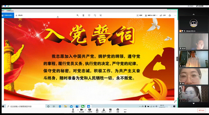 在支部副书记吴静谊的领誓下,全体参会党员在镜头前起立,举起右拳进行宣誓,“我志愿加入中国共产党,拥护党的纲领、遵守党的章程、履行党员义务、执行党的决定、严守党的纪律、保守党的秘密,对党忠诚、积极工作,为共产主义奋斗终生,随时准备为党和人民牺牲一切,永不叛党。”一声声掷地有声的承诺也预示着测通学院学生第五党支部全体党员的决心。