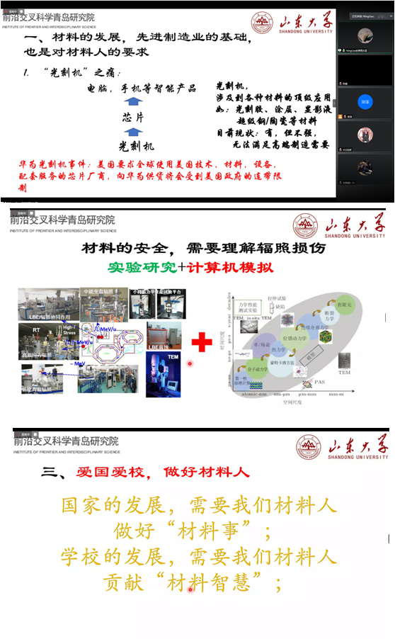 学术讲座由无机非金属材料系主任吴泽主持。讲座开始前,石德全副院长代表学院对高宁教授表示热烈欢迎,并感谢高宁教授在百忙中通过线上为永利官网师生做学术讲座,把自己多年来的专业经验、工作积累分享给师生们。高宁教授回顾了自己学习和研究的历程,激励学弟学妹们刻苦学习,锻炼自主学习能力;介绍了我国当前制约技术进步的材料方面的问题,鼓励学弟学妹们为国建功;重点讲述了核能材料的实验及计算模拟方法。