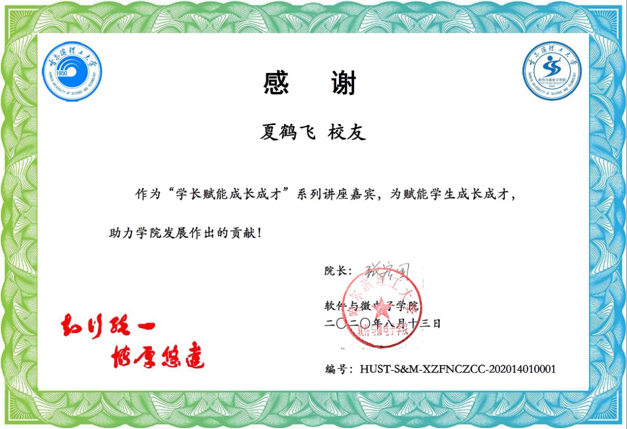 在讲座的最后,黄海副院长代表学院为夏鹤飞颁发了专属感谢证书和专属毕业指环。他对该系列活动越办越好充满信心,相信该系列活动会越办越好,形式会越来越丰富,受益学生面会越来越广。此活动得到学院领导和老师的大力支持,讲座嘉宾和部分师生进行了线上合影留念。