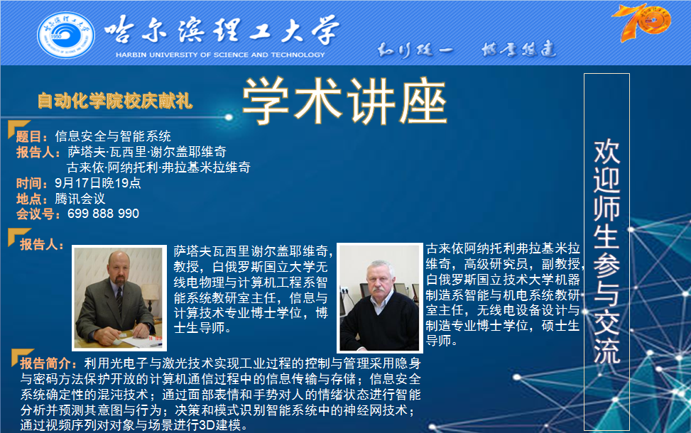 致敬校庆,盛会如约!喜迎学校七十华诞,推进对俄产学研交流,自动化学院倾情献礼!9月17日,自动化学院邀请白俄罗斯国立大学无线电物理与计算机工程系智能系统教研室主任萨塔夫瓦西里谢尔盖耶维奇教授团队、白俄罗斯国立技术大学机器制造系智能与机电系统教研室主任古来依阿纳托利弗拉基米拉维奇副教授、高级研究员团队,做了关于“智能控制系统与信息处理技术”的专题讲座,两位专家及其团队成员与我院师生在线分享交流,共谋学科发展,共话合作未来。