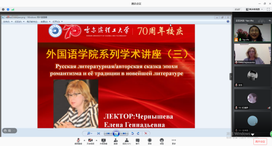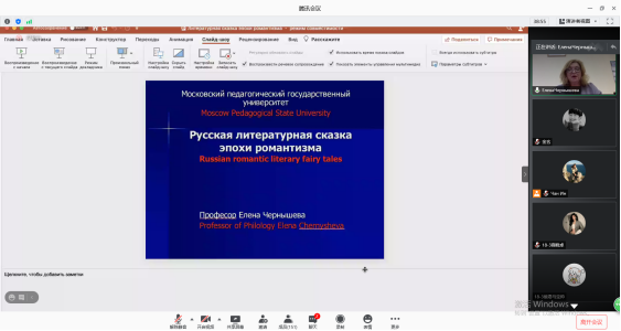 9月18日18:00外国语学院70周年校庆学术讲座(三)通过腾讯会议平台成功举办。受学院外国语言文学研究中心科研工作坊邀请,俄罗斯莫斯科国立师范大学文学院院长ChernyshevaElena Gennadevna教授主讲《俄罗斯浪漫主义时期文学/作家童话及其在现代文学的传统》。校内外专家、学者及在校本硕学生150多人相约云端参加讲座。