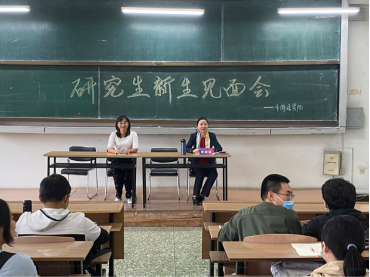 外国语学院党委副书记兼副院长周晓丽、研究生辅导员于海滨在新生见面会上给学生答疑