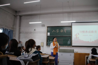 由学院党委副书记周晓丽主持进行习惯养成教育,她以幽默的开场方式,以校园趣事代入情景,贴切地为同学们讲述区分了大学学习与高中学习的不同,强调了大学学习的重要性,为同学们明确了大学学习的目标与方向。她又叮嘱了同学们在校日常生活中的注意事项,寝室安全中需注意不要使用违规电器,注意寝室卫生,关心寝室同学。人际交往中要注意尊重他人,求同存异,善于发现他人的优点。师生关系中要尊敬老师,懂礼明理,出现问题要及时与老师沟通。周晓丽对新生同学们的深深关爱,引起了新生同学们的热烈反响。