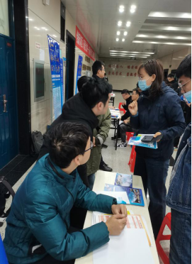 外国语学院辅导员李竖新、王梓懿与用人单位洽谈,帮助毕业生投简历