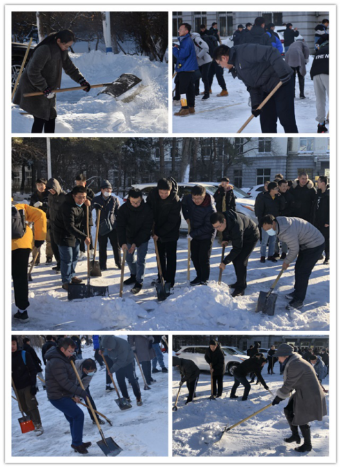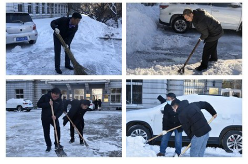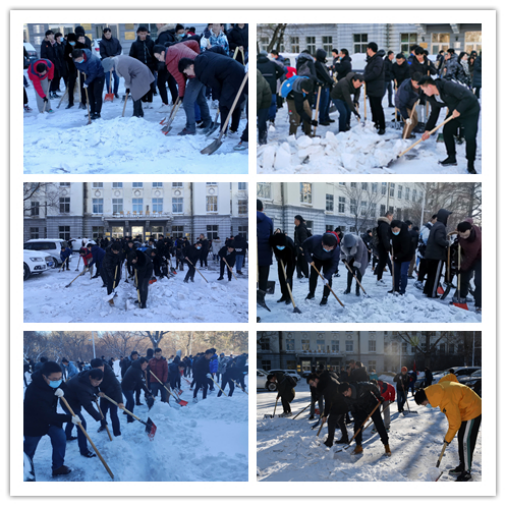 室外温度很低,学院班子成员带领师生党员不惧风雪、挥动铁锹、铲除冰雪、干劲十足、热火朝天的劳动场面让严寒的天气显得暖意浓浓,皑皑白雪下一个个忙碌的身影也展现出党员的风采。经过近一个小时的奋战,5号楼前积雪清扫干净,为大家开辟了一条洋溢着温情的通畅之路。