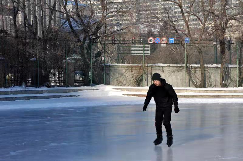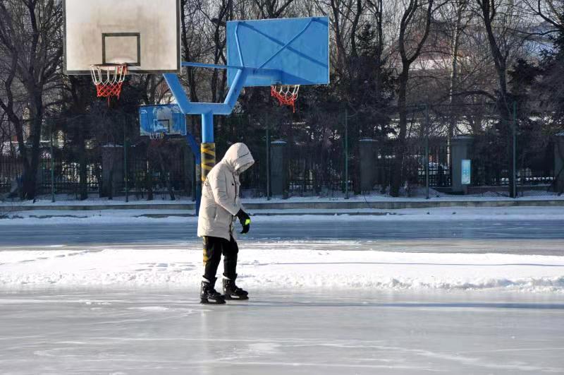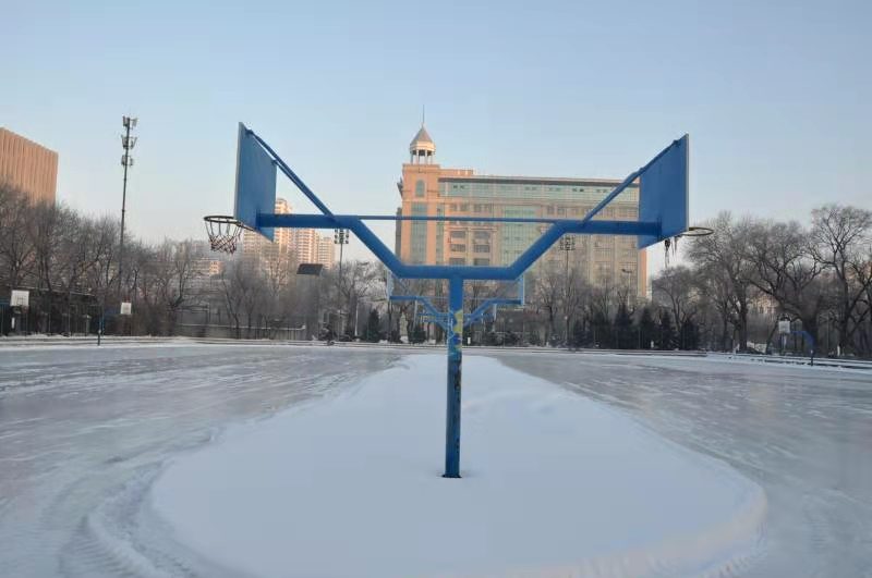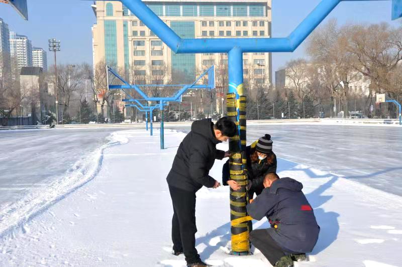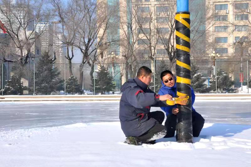 初具规模的冰场正被精心打扮——加装防护层,用以避免学生们滑行过程中撞伤事件的发生。