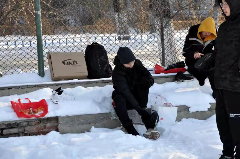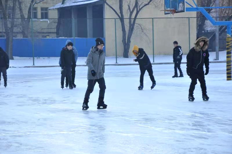 平整光滑的冰面吸引了同学们的到来,迫不及待的要到冰上体验今冬的第一次滑冰。