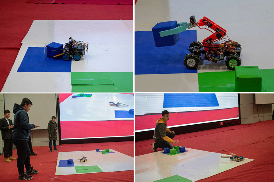 比赛共分为三个项目,分别是A题搬运机器人,参赛小组成员通过操作端对机器人进行操控,实现机器人的运动控制。通过操控机器人的位置使得让物块进入机械臂之间,再由人工控制机器人将物块推至指定同色区域。B题智能水温控制系统,运用单片机、加热装置、制冷装置、显示屏等方面实现对水温的升高与降低调控,并在规定时间内尽快完成。C题打靶机器人,通过人工遥控和显示屏上对图像的显示进行瞄准发射子弹成功击中目标,并通过更换线路进行自动瞄准射击。