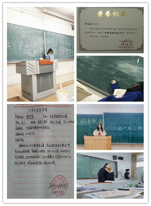 思想引领,敢于担当。2017年入学第一天,她有幸聆听了由殷景华教授在学院做的以”传承大珩精神做新时代哈理工人”的报告,在后期辅导员与专业教师的引导下,她立志要做一名“忠诚祖国、献身科学、淡泊名利、寻优勇进”的青年大学生。在思想上,她积极向党组织靠拢,尽职尽责,勇于奉献,时刻发挥着党员先锋模范作用,带领班级团支部严格按照团的“三会一课制度”开展各项团员活动,她团结同学,关心集体,是同学们学习的好榜样;在学习上,她刻苦努力,成绩优异,崇尚科学;在生活中,她乐于助人,每学期都为班级后进生补课,为班级同学答疑;在性格上,她乐观向上,积极进取,虽然家境贫寒,但她自立自强,克服各种困难。