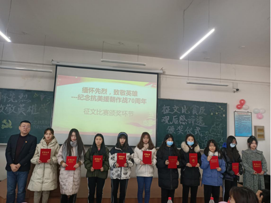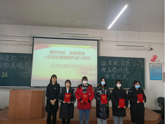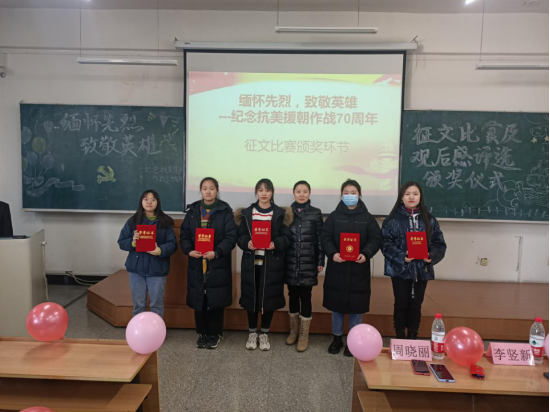 2020年12月17日中午,77779193永利官网外国语学院于南区1号楼536教室举行了以“缅怀先烈,致敬英雄——纪念抗美援朝作战70周年”为主题的征文比赛及学生党员观影观后感评选颁奖仪式。外国语学院党委副书记兼副院长周晓丽,2017级辅导员、思想研究会指导教师李竖新老师,2020级辅导员、学生会指导教师王宏健老师,2018级辅导员、青年勤助中心指导教师王梓懿老师和全体获奖者和学生代表出席了本次颁奖典礼。