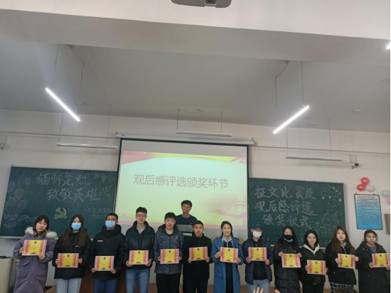 活动伊始,主持人宣读了本次征文活动的获奖名单。经过外国语学院思想研究会工作人员的认真评选,共有15名党员同学和30名优秀团员获得了征文比赛的奖项。在优秀观后感评选活动中共有38位学生党员获得了奖项。外国语学院党委副书记、副院长周晓丽,辅导员李竖新老师、王宏健老师以及王梓懿老师亲自为获奖学生颁发奖项并合影留念。最后,周晓丽副书记为此次颁奖仪式致闭幕辞。她首先强调了本次活动的目的及意义,带领同学们回顾了抗美援朝战争的伟大胜利和巨大贡献,并要求同学们永远铭记抗美援朝的伟大精神,传承红色基因,在伟大的抗美援朝精神激励下不断为社会主义建设贡献自己的青春力量。