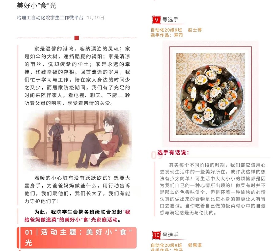 一、做好思想引领。上好疫情防控这门“思政大课”,始终坚持以学生为中心,组织开展网络“云党课”、“云团日”活动21场,加强对学生的思想教育和价值引领。依托学院学生工作微信公众平台、各年级学生工作群、各年级家长群用心、用力、用情密织宣传网:第一,面向全体学生发布《假期战疫“七坚持”》倡议、开辟防疫专栏、发布温馨提示、转发防疫知识,向学生传递科学防护方法,掌握思想动态,开展防疫宣传,让寒假在家的学生们多了一份安全感、踏实感。第二,开设《战“疫”日记》专栏,积极宣传学院学子疫情防护期间的志愿服务活动,践行伟大抗疫精神,为广大学生树立榜样。截止到目前,学院共有29名学生毅然投身于属地疫情防控志愿服务工作,服务时长近千小时。同时,将青年人的战疫故事汇总成《了不起的新时代青年》专辑,由学生自己讲述,鞭策青年弘扬抗疫精神,勇担时代使命。第三,继续夯实我院孝亲感恩教育品牌,开展《我给爸妈做道菜》评选活动,征集作品58个,云端晒美食,暖心诉感恩。