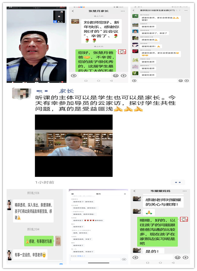 在疫情防控的特殊时期,理学院院“云家访、云就业”活动搭起了家校沟通、师生对话的平台,消除了学生的担忧、家长的顾虑,为学生成长成才“护航”,受到了学生、家长们的认可和肯定。材物17-2班周之岱的爸爸在家访中表示:“感谢理学院开展这次“云就业、云家访”活动,感谢老师的精心准备和详细的讲解,此次家访活动不仅是让我们家长了解了目前的就业形势,更为我们家长朋友指明了接下来努力的方向,希望今后能与学校保持密切的联系与沟通”。统计17-1班韦耀耀家长说:“感谢学院的这次云家访、云就业活动,感谢老师对孩子的关心与教育”。应物18-2班张文惠家长会后发朋友圈说:“听课的主体可以是学生也可以是家长,今天有幸参加理学院辅导员老师云家访,探讨学生共享问题,真的是受益匪浅”。应物18-1班袁志豪家长说:“平时关注孩子们的时候很少,辅导员老师家访中讲的框架清晰,精辟透彻,深入浅出,条理清晰,孩子们能得此良师益友幸甚至哉,感谢老师,感谢学校”。还有很多家长反馈说:“此次“云家访、云就业”活动,不仅让家长与学校走的更近,对学生了解的更多,更有助于家长与学校肩并肩,同心同力完成对学生的培养,利于学生成长成才”。